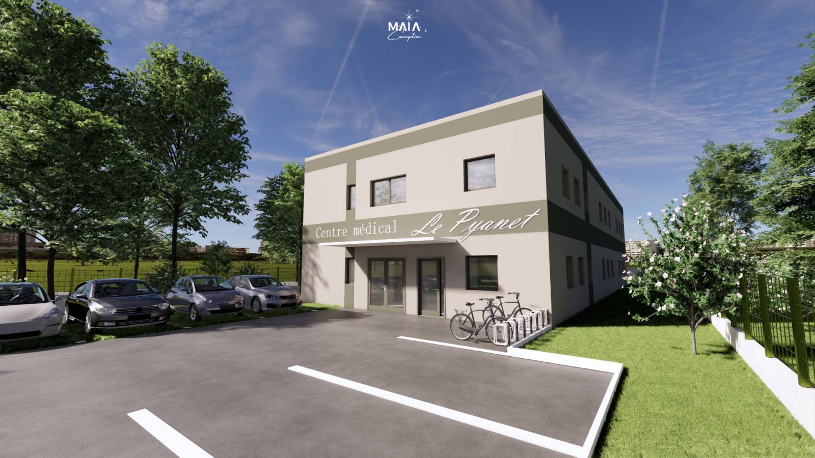 Un parking est aménagé directement devant le bâtiment afin de faciliter l’accès aux patients et d’optimiser les flux de circulation. Une enseigne visible portant la mention « Centre médical Le Pyanet » sera installée sur la façade principale pour assurer une identification claire depuis la voie publique. Un portail viendra compléter l’ensemble afin de sécuriser le site lors des périodes de fermeture.